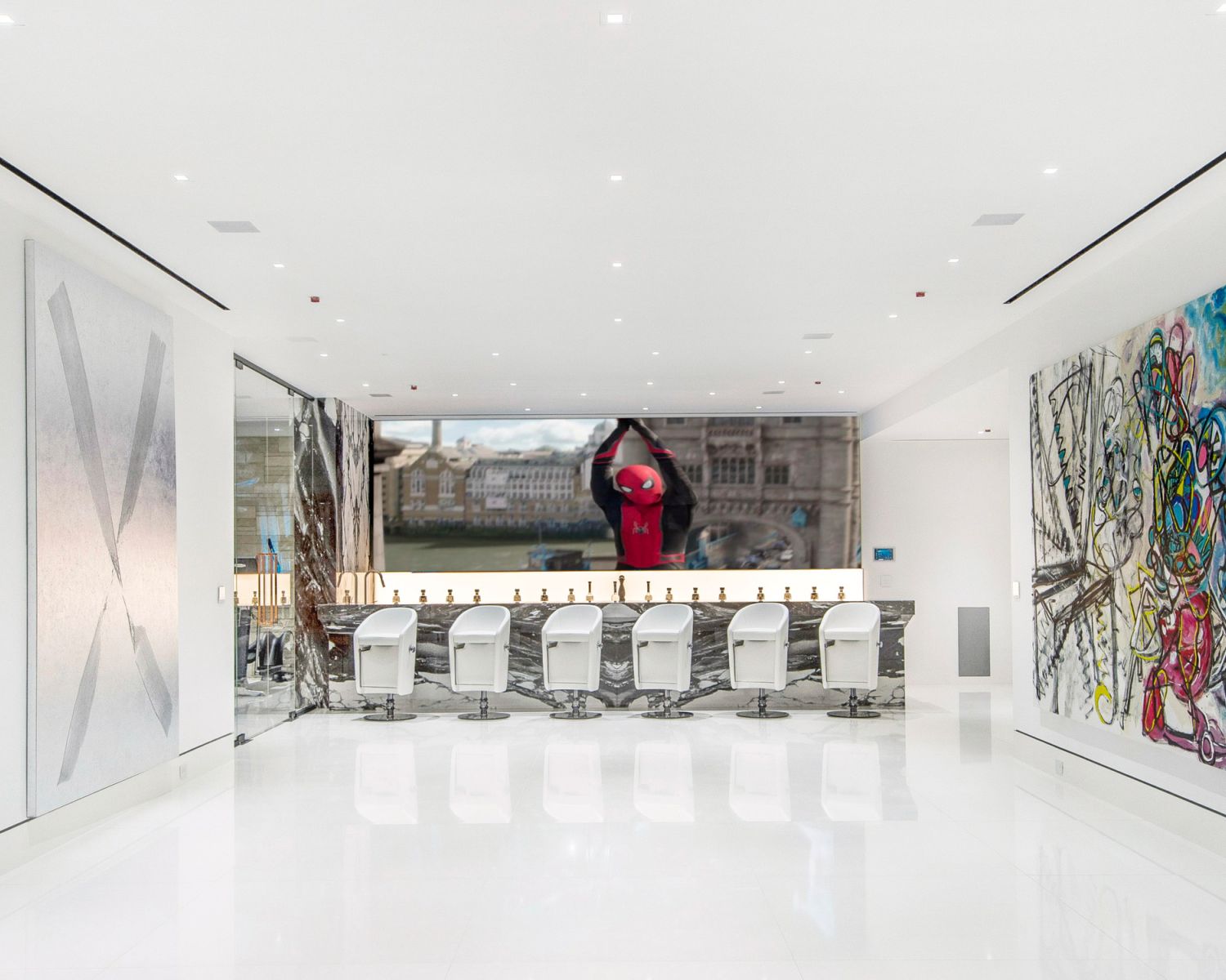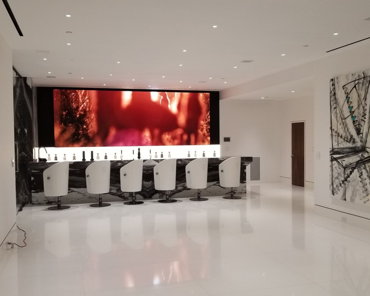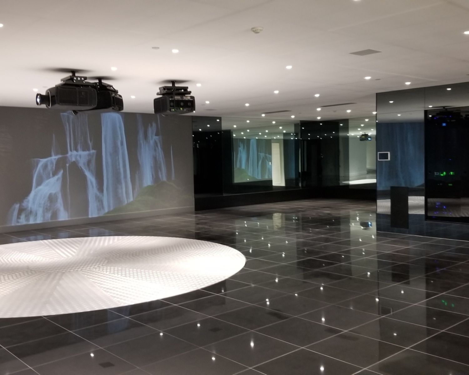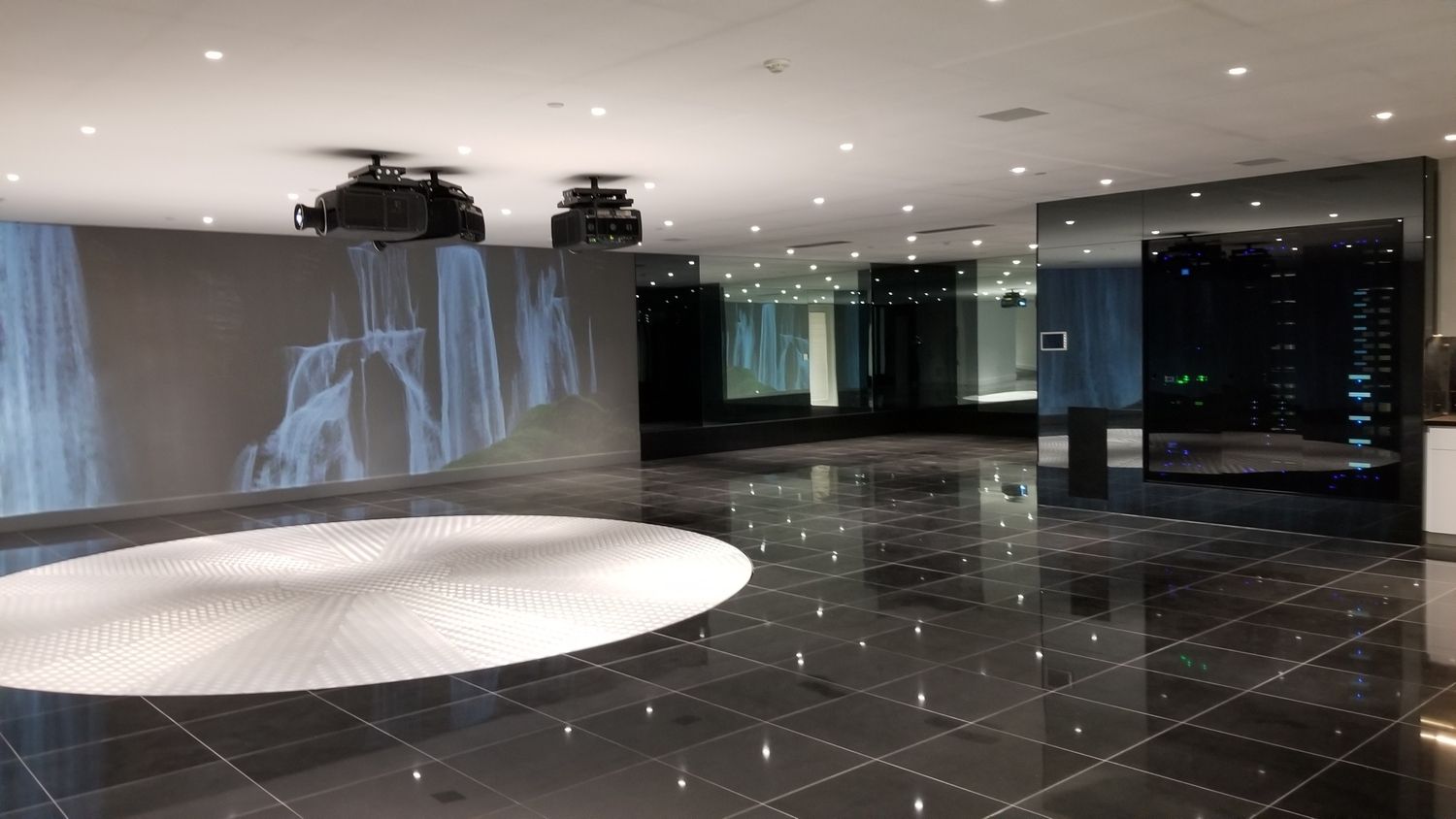 But perhaps the most compelling installation in the entire home is the 88' wide custom projection video wall incorporating three 4K projectors, which played a loop of a custom 3D rendering of a waterfall in the showcase subterranean garage.