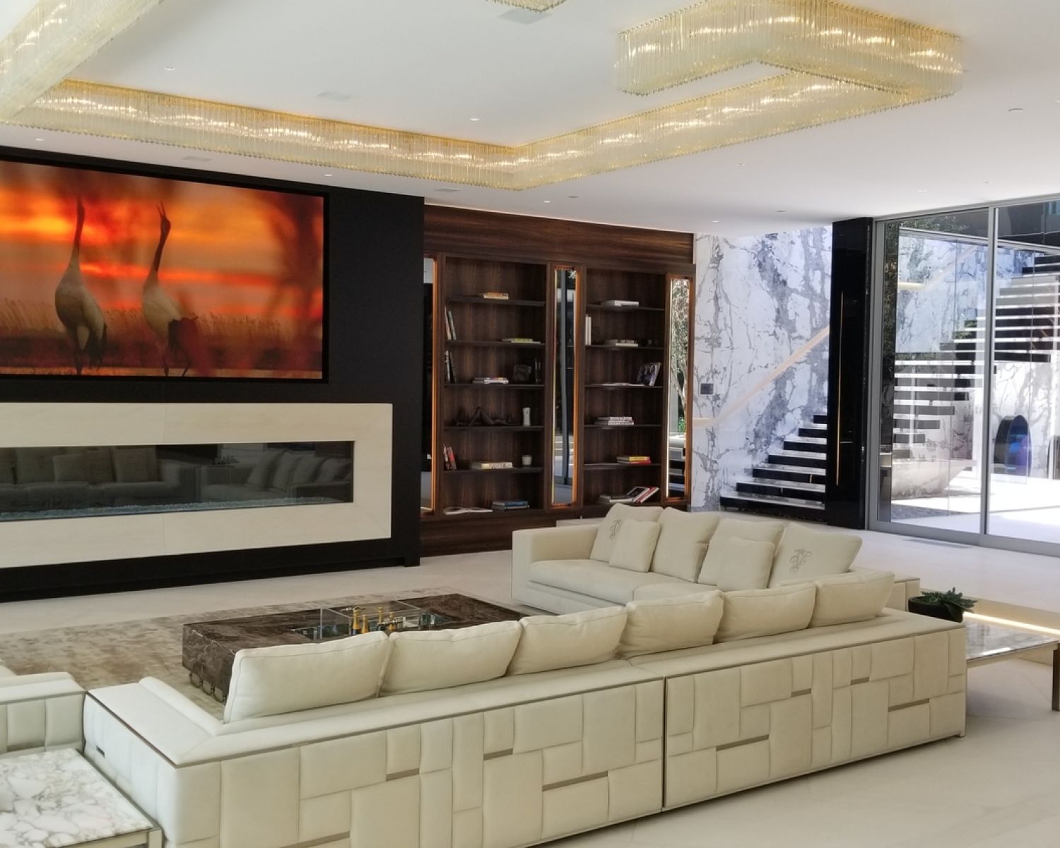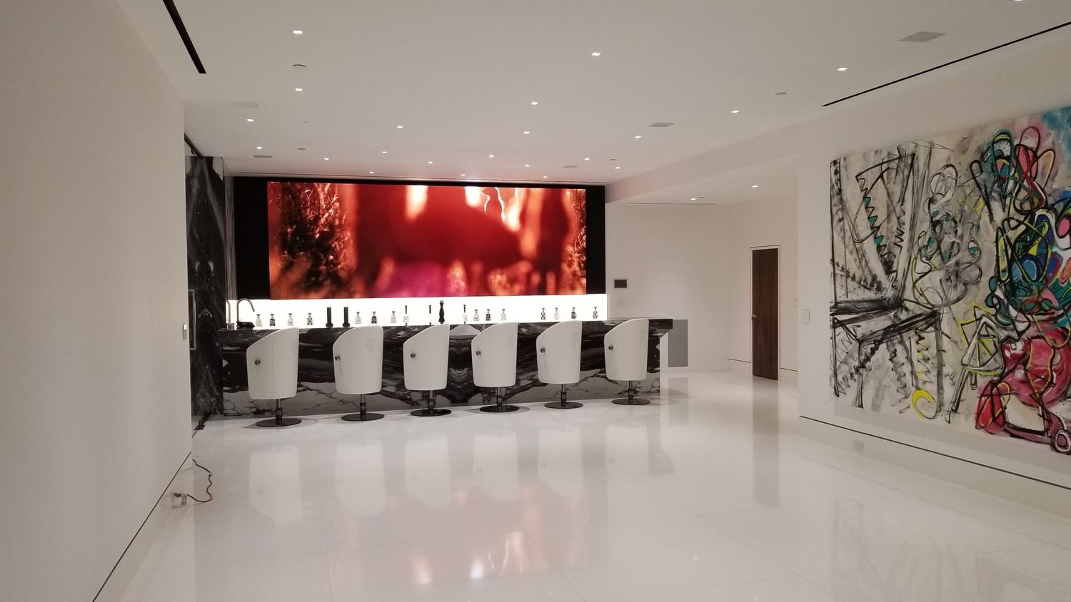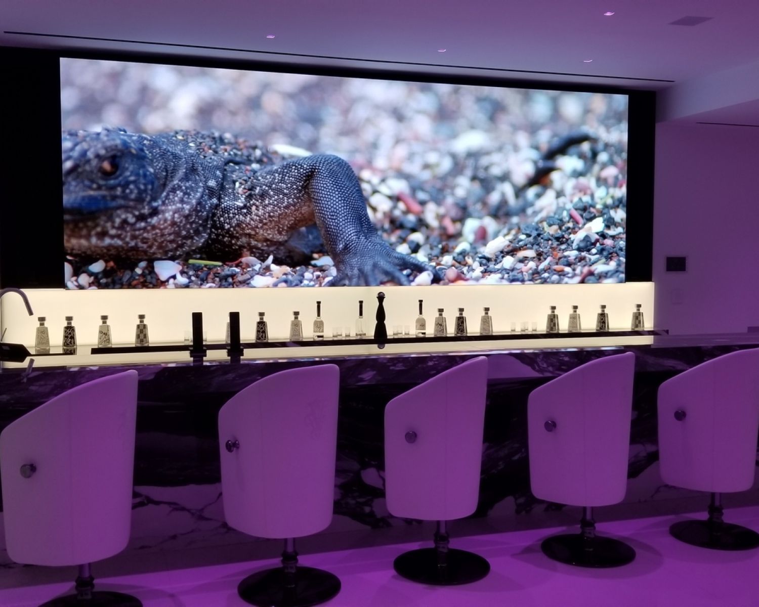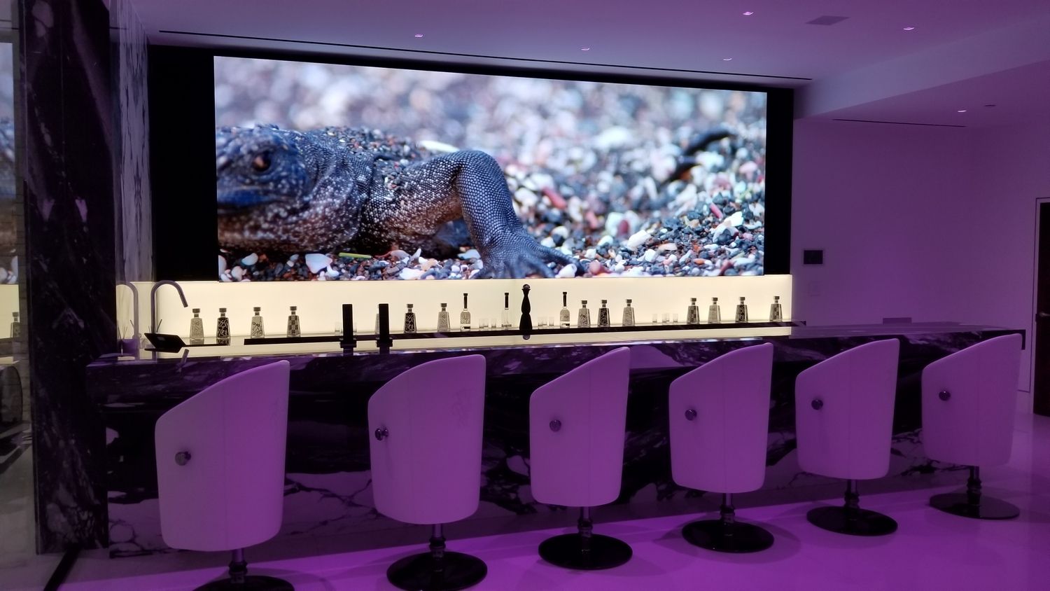 But perhaps the most compelling installation in the entire home is the 88' wide custom projection video wall incorporating three 4K projectors, which played a loop of a custom 3D rendering of a waterfall in the showcase subterranean garage.