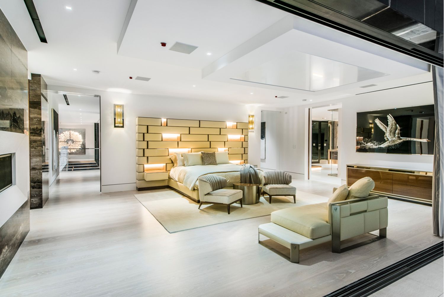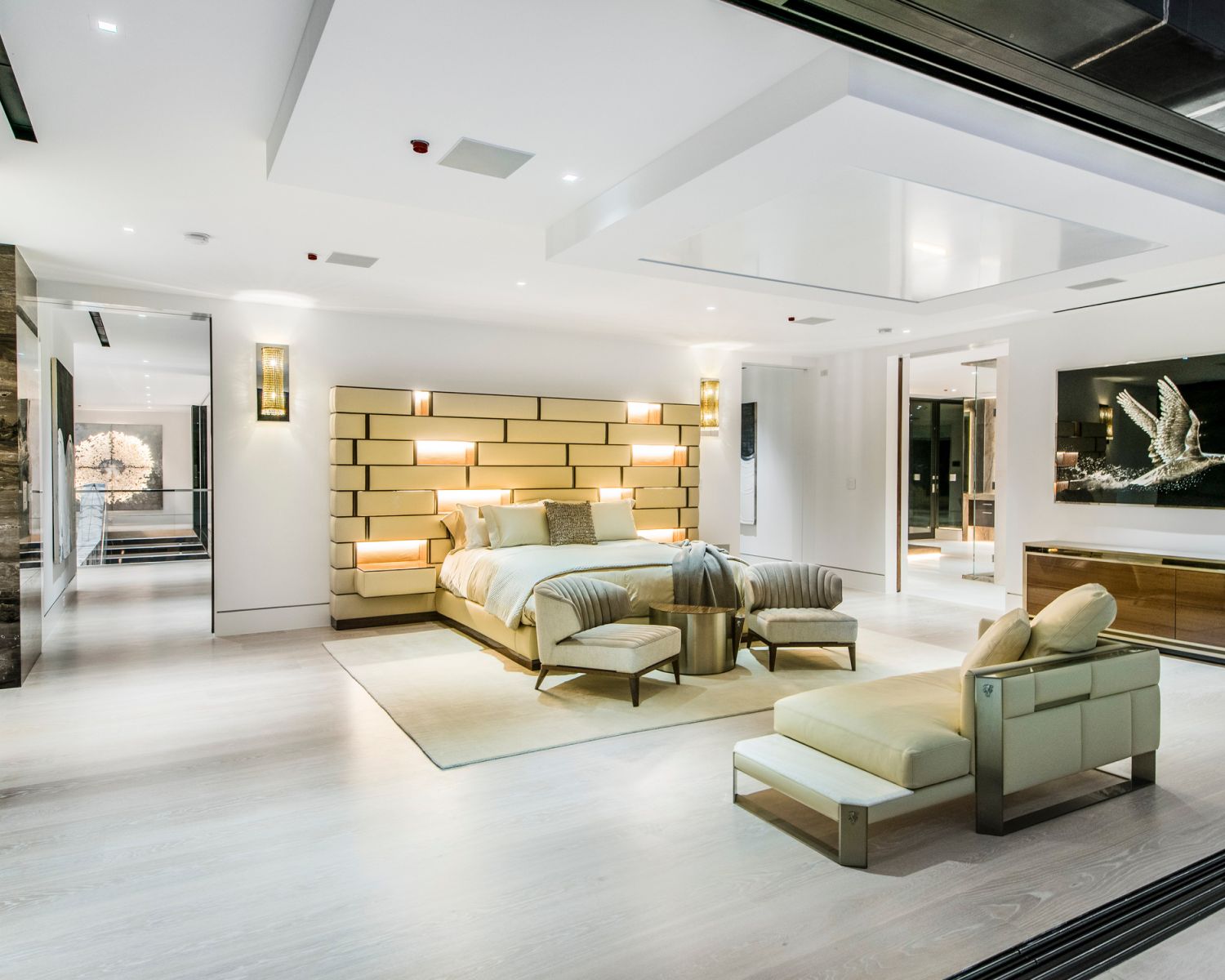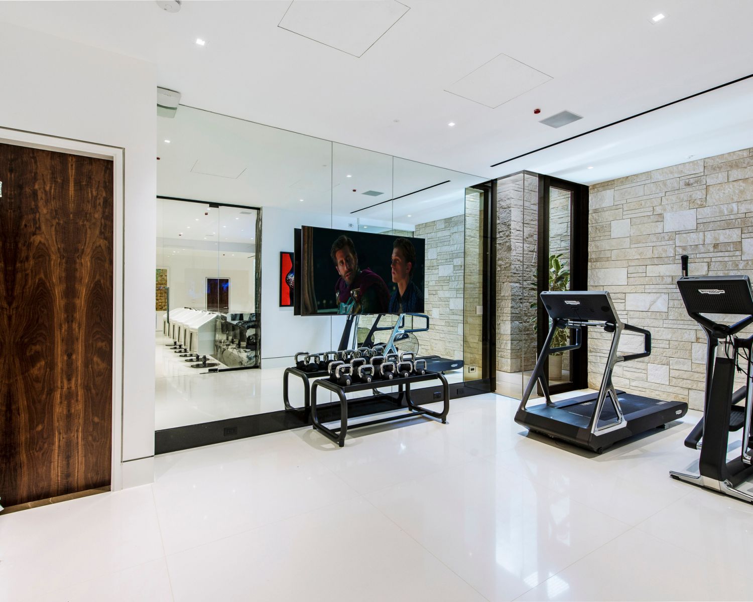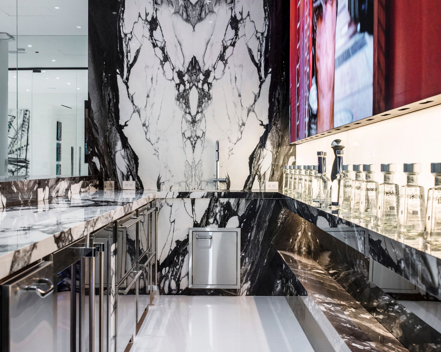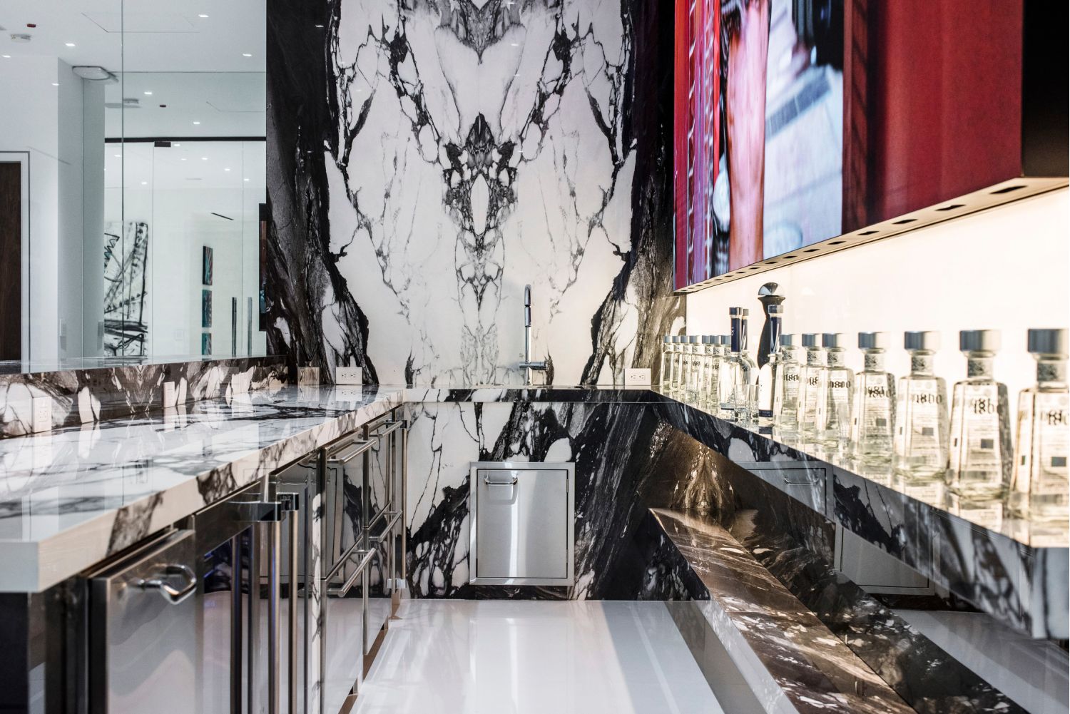 But perhaps the most compelling installation in the entire home is the 88' wide custom projection video wall incorporating three 4K projectors, which played a loop of a custom 3D rendering of a waterfall in the showcase subterranean garage.