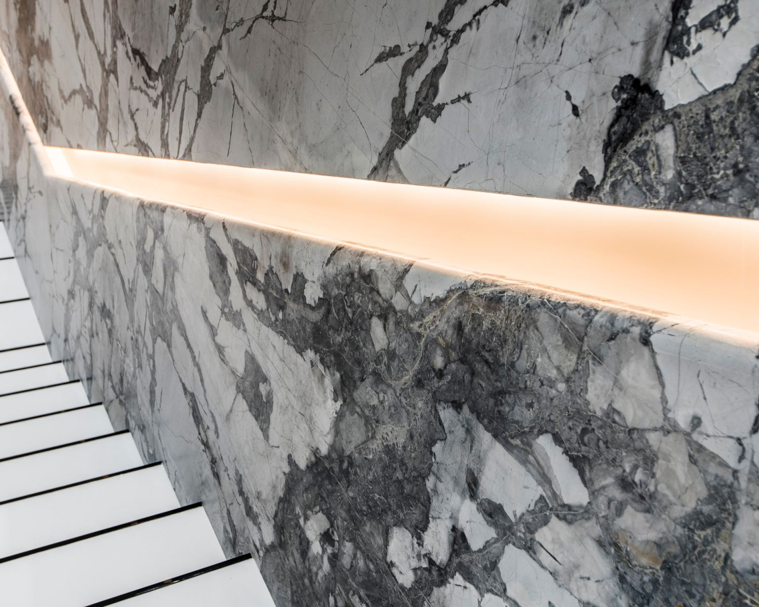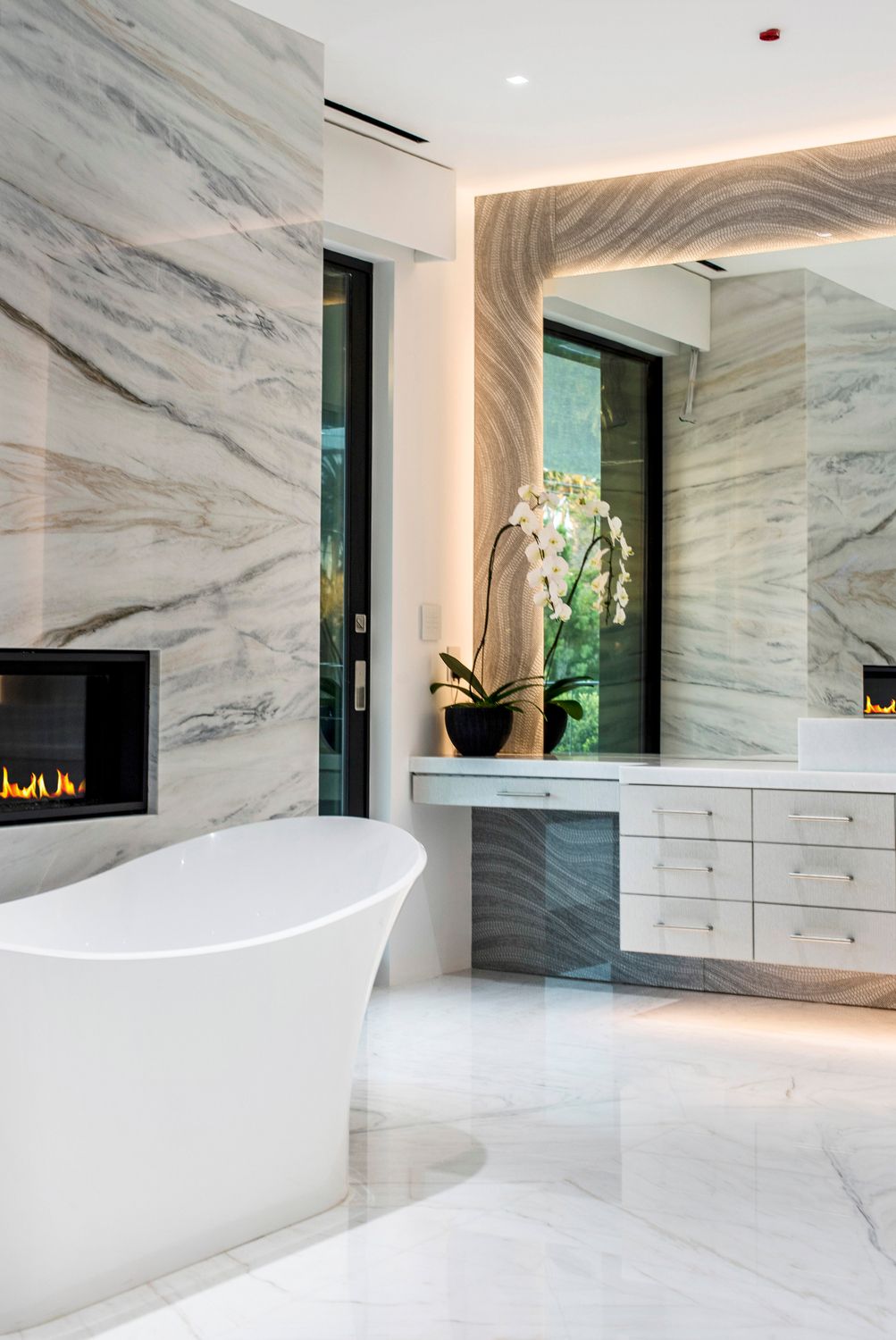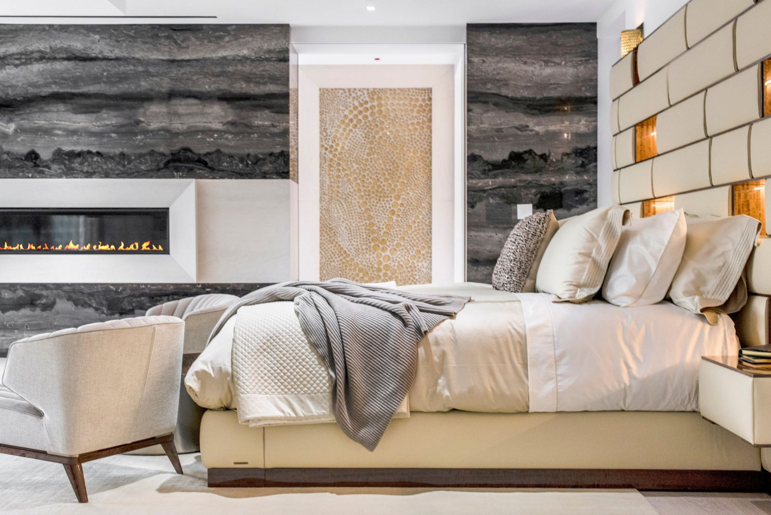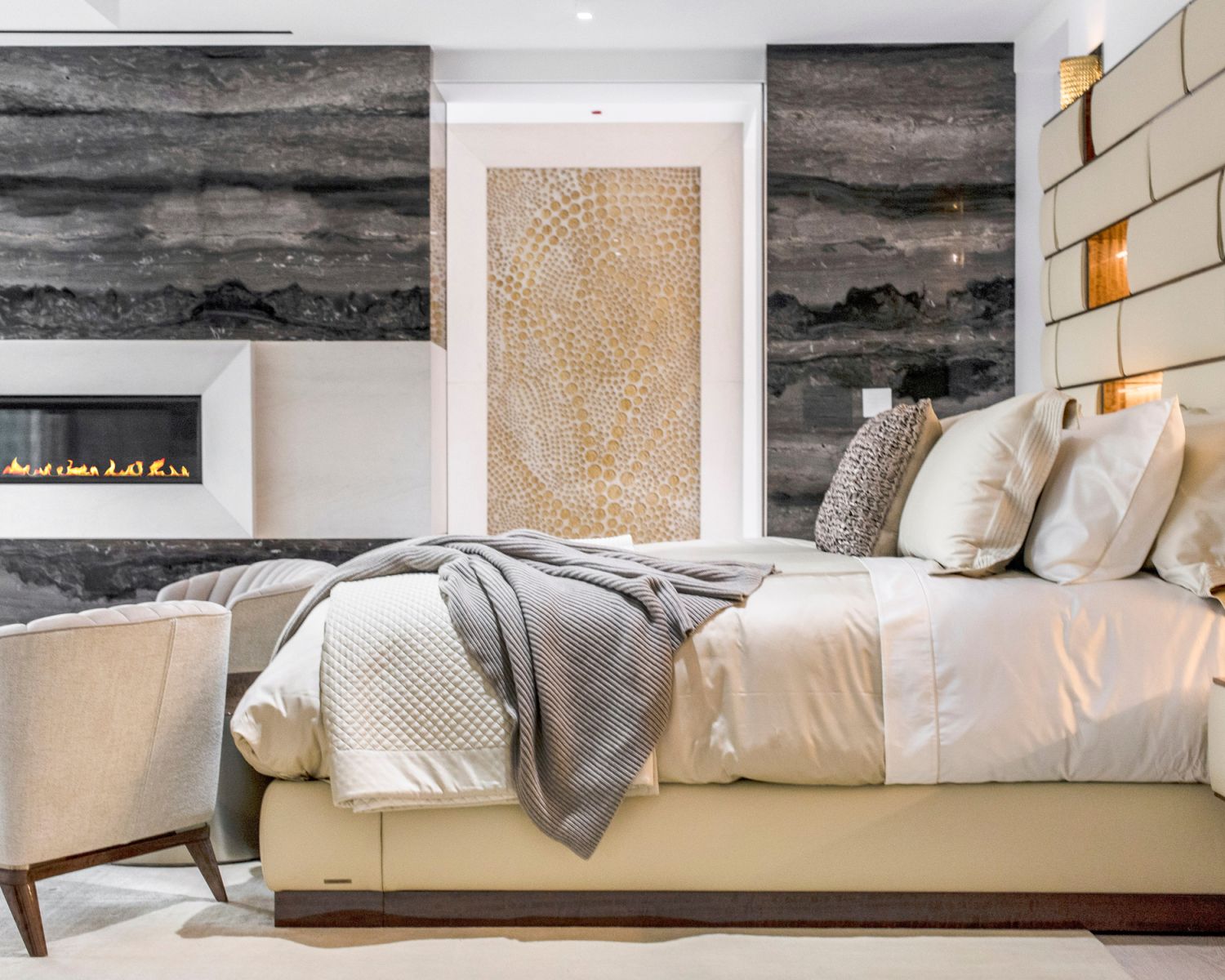But perhaps the most compelling installation in the entire home is the 88' wide custom projection video wall incorporating three 4K projectors, which played a loop of a custom 3D rendering of a waterfall in the showcase subterranean garage.