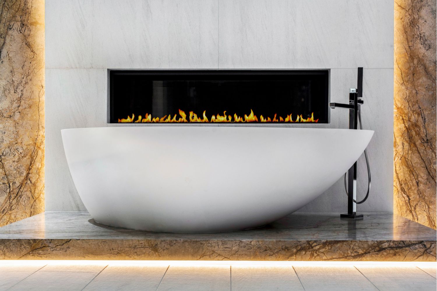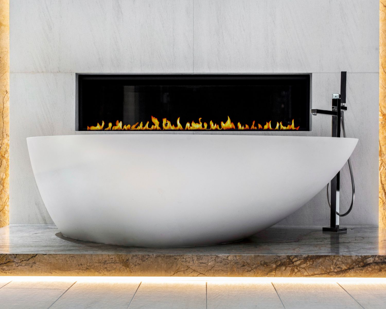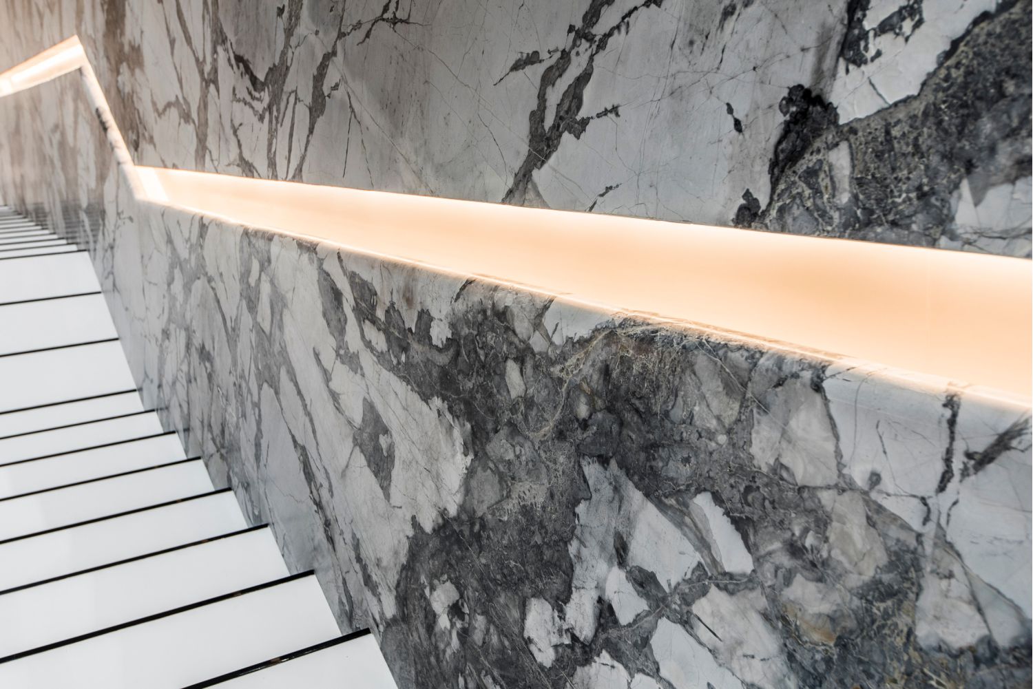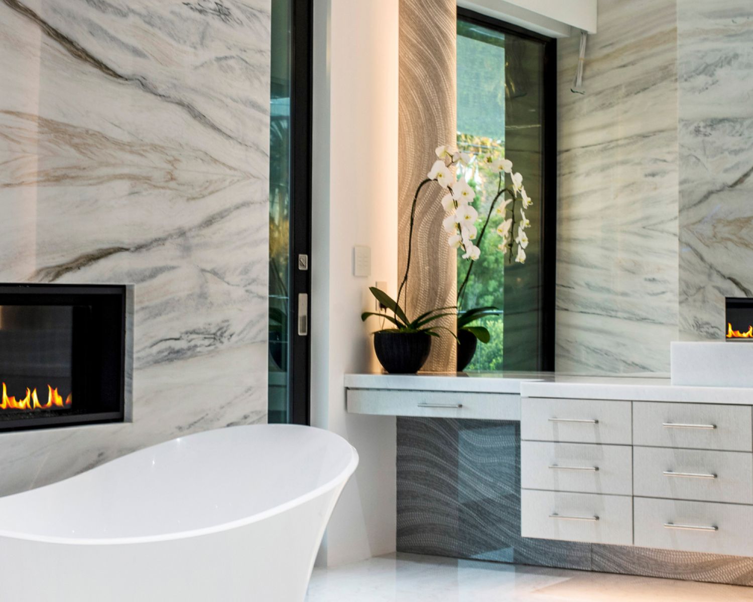 But perhaps the most compelling installation in the entire home is the 88' wide custom projection video wall incorporating three 4K projectors, which played a loop of a custom 3D rendering of a waterfall in the showcase subterranean garage.