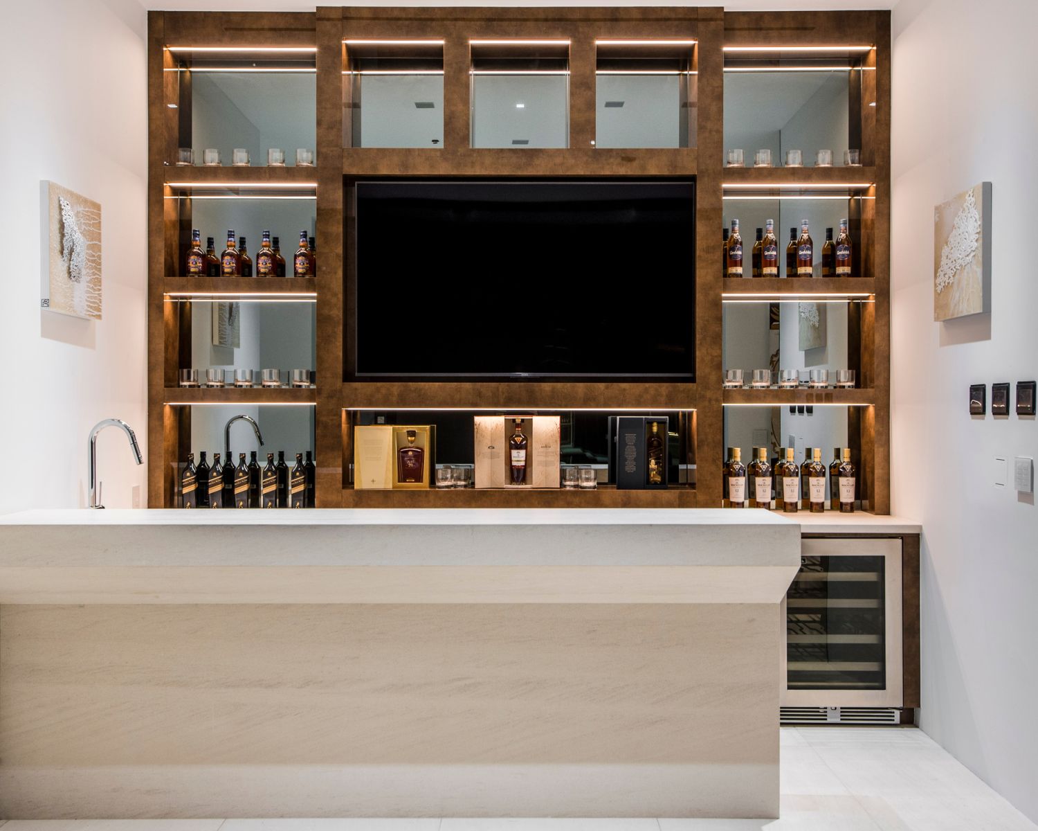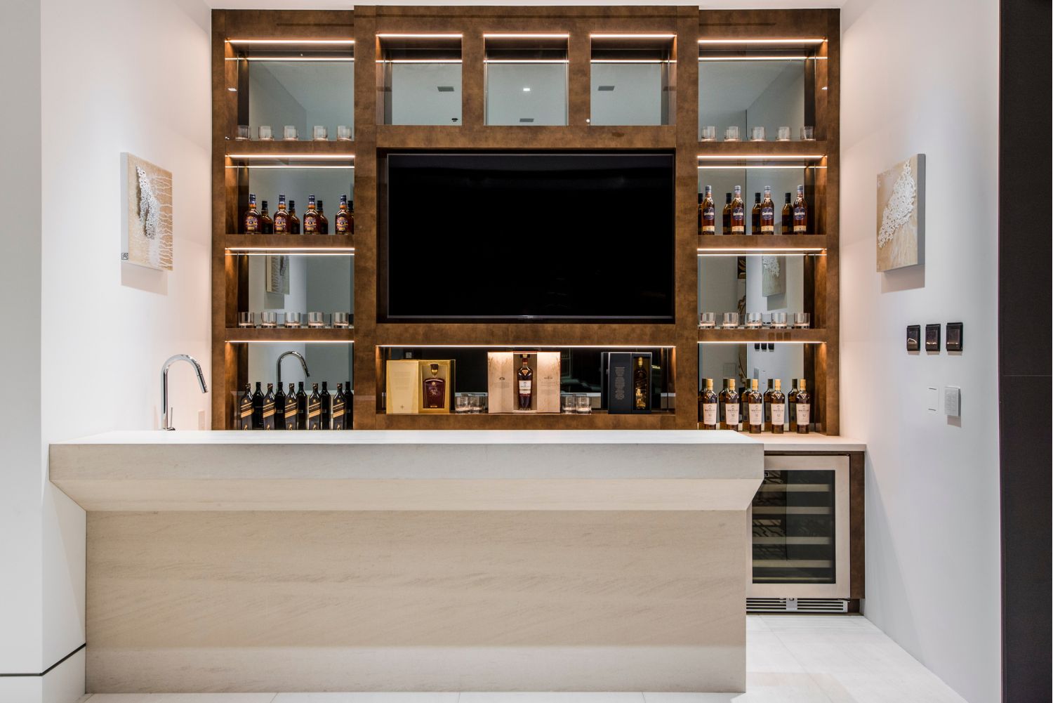 With its multi-million dollar price tag, this residence had to have an instant wow factor in every single space. This design intent allowed AUDIOVISIONS to showcase their creative talent fully. The home features super high-performance audio and video coupled with the latest in-home technology, including Ketra Lighting, Lutron Lighting Controls, and a Delos Darwin healthy living system. Even standard systems like video were supersized with two video wall installations in both the basement bar and living room.