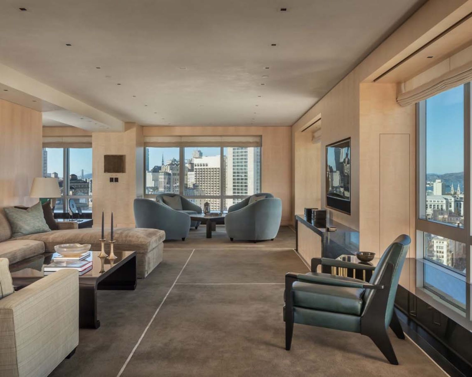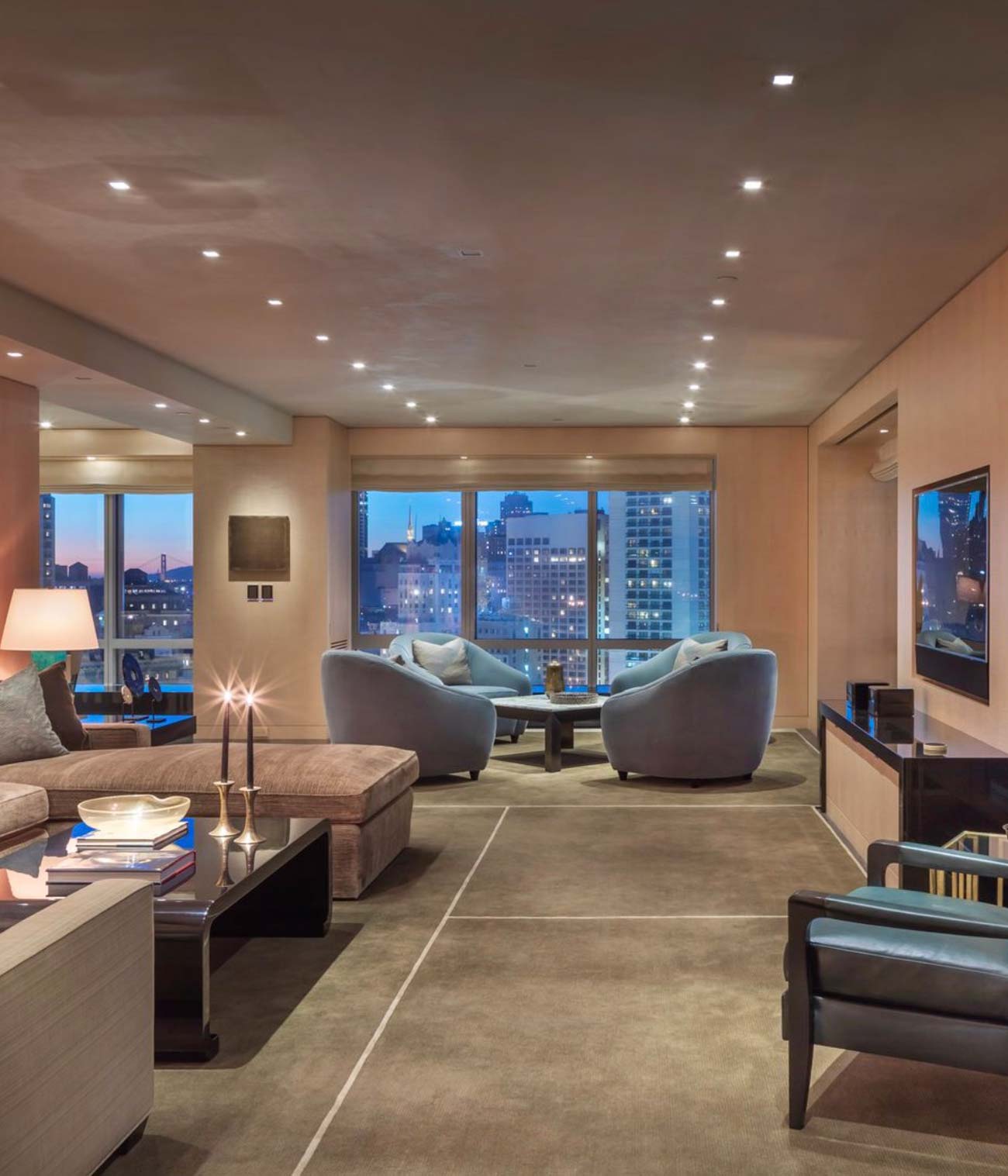 The project had a high level of fit and finish, blending two units into one larger unit. It also included a theater. Executing this in a San Francisco high rise proposed many challenges. AUDIOVISIONS installed a Savant system, complete with control and full sub system integration. TV’s and soundbars were installed so they could sit tightly in the cabinetry, giving the best picture and sound quality. James small aperture in-ceiling speakers were used for music throughout the residence matching the lighting design perfectly.